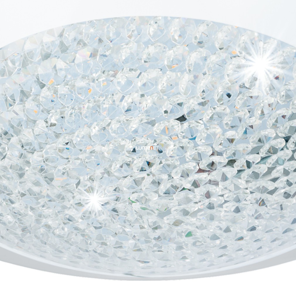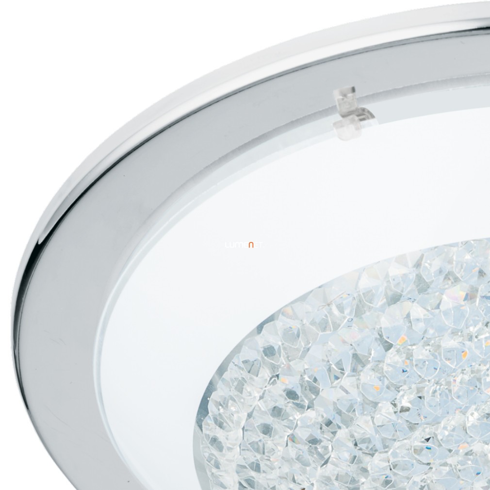 Eglo Lighting Acolla LED flush ceiling fitting features a circular ceiling plate and frame in polished chrome finish with a central display of clear crystal buttons and white glass.