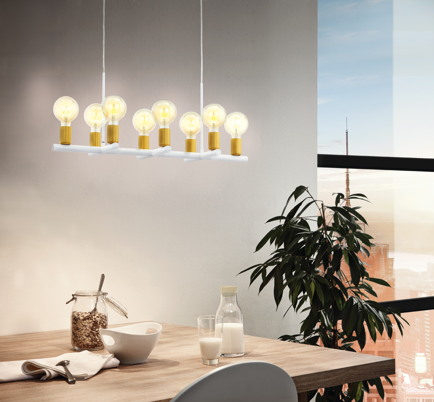 Eglo Lighting 'Adri 2' eight light ceiling pendant features a bar style ceiling plate with 2 suspension cable holding a white finish bar frame and 8 gold finish lamp holders.