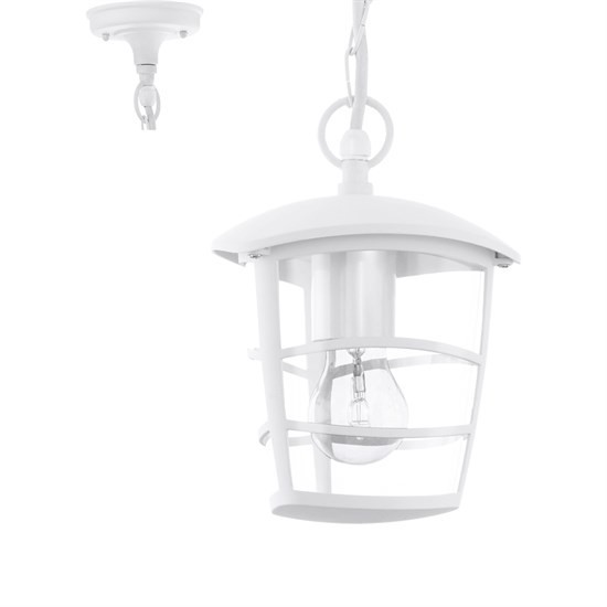 Eglo Lighting Aloria single light outdoor ceiling pendant features a circular design ceiling plate with decorative chain holding a hanging lantern style lamp head in white finish and clear acrylic panels.