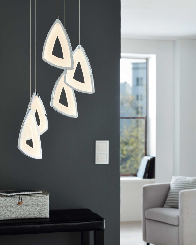 Eglo Lighting Amonde 5 light ceiling pendant features a circular ceiling plate in polished chrome finish with 5 suspension wires, positioned at different heights, holding triangular shaped light diffuser in polished chrome and satinated acrylic finish.