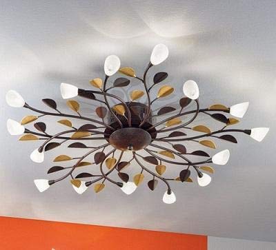 Eglo Lighting Campania 15 light ceiling fitting features a circular ceiling plate with decorative multi arm frame in antique brown finish with leaf detail and 15 limed glass shades.