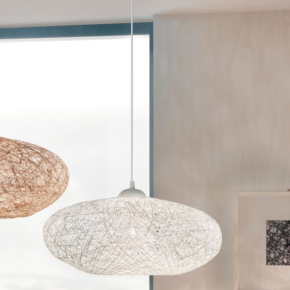 Eglo Lighting Campilo single light ceiling pendant features a woven mesh design oval shade suspended from a cone shaped ceiling plate all in white finish.