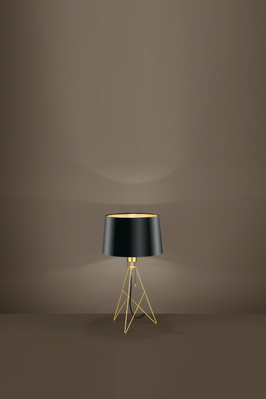 This is an Eglo light from the Camporale range. The product code is 39179. This modern table lamp has a tripod style gold stand with a black shade. Simple and modern, it will be a welcome addition to many rooms in the home.