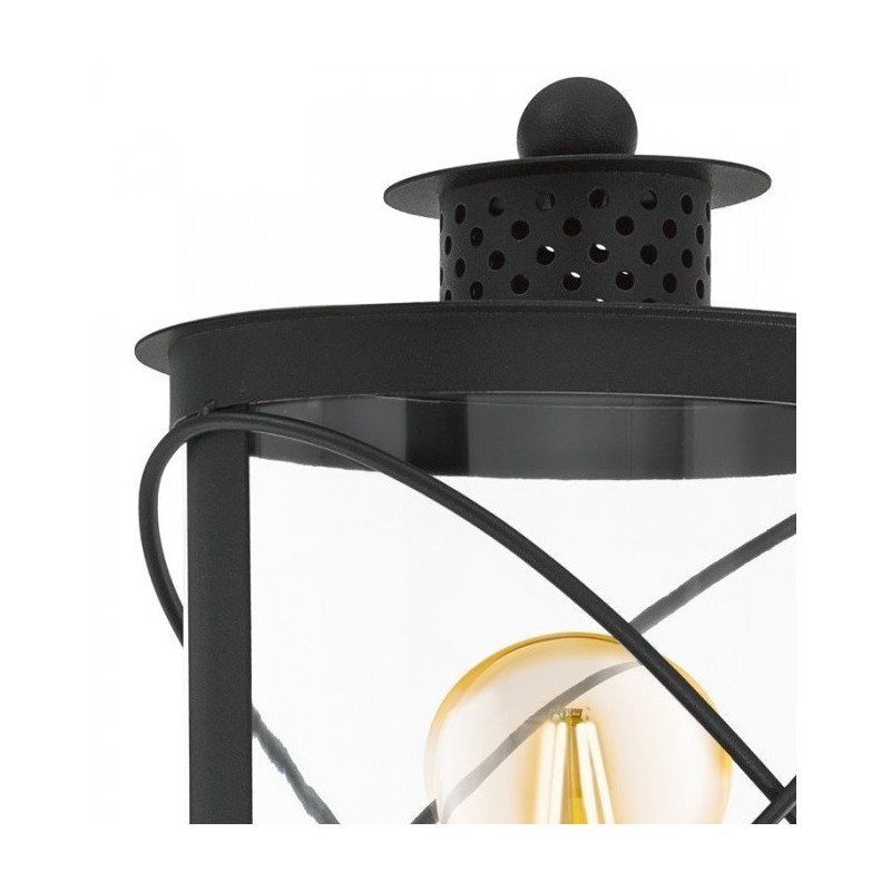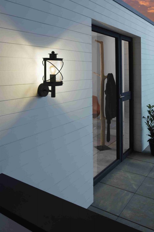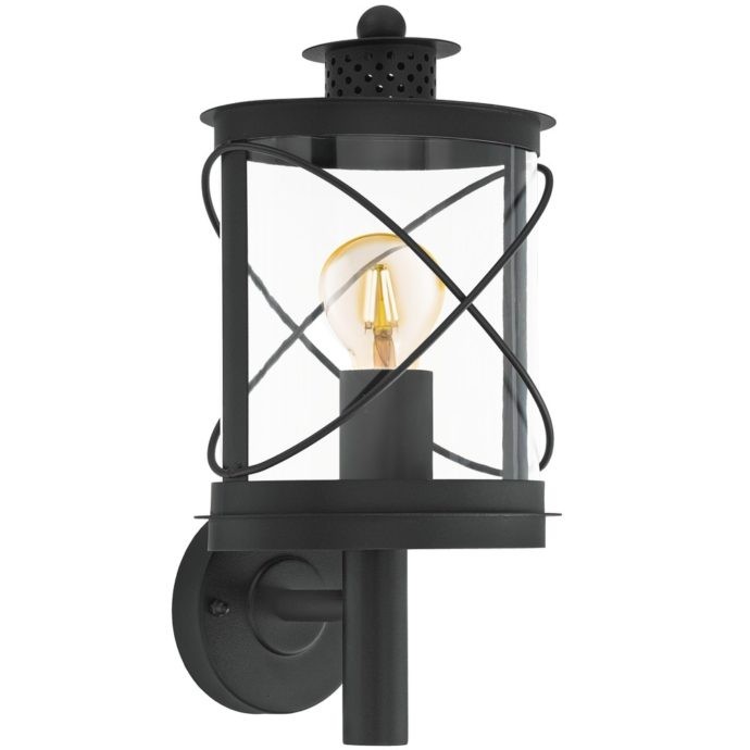 Eglo Lighting Hilburn single light outdoor wall fitting features a circular back plate with extending arm, made from zinc plated steel, in black finish with a lantern style shade and clear acrylic light diffuser.