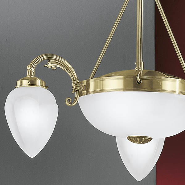 Eglo Lighting Imperial 5 light ceiling fitting features a solid cast metal frame with a bronze finish holding a central white satinated dome shaped glass shade and 3 small tulip shaped shades on decorative curved arms.