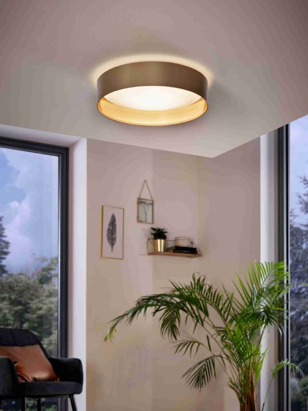 31624 Maserlo LED ceiling light. This light fitting is made from plastic, steel with a white finish. It has a taupe, gold fabric shade(s)