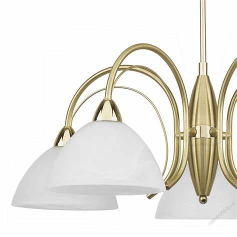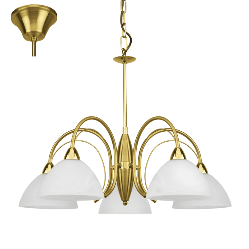 Eglo Lighting Melia 5 light ceiling pendant features a circular satin brass ceiling plate with curved arms and 5 dome shaped alabaster glass shades.