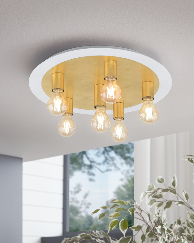 Eglo Lighting Passano 6 light semi flush ceiling fitting features a circular back plate in gold finish with white edging, holding 6 lamp holders with vintage filament style lamps.This unusual design will create an interesting lighting style , the combination of gold and white with the vintage filament lamp completes the look, making this perfect for both modern or contemporary decors. Especially suitable for rooms with low ceilings.