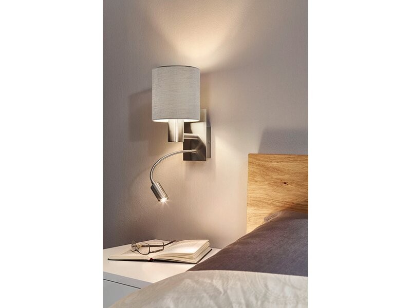 Eglo Lighting Pasteri single light wall fitting features a satin nickel finish wall plate with extending arm with a cylindrical shaped white fabric shade and copper inner.