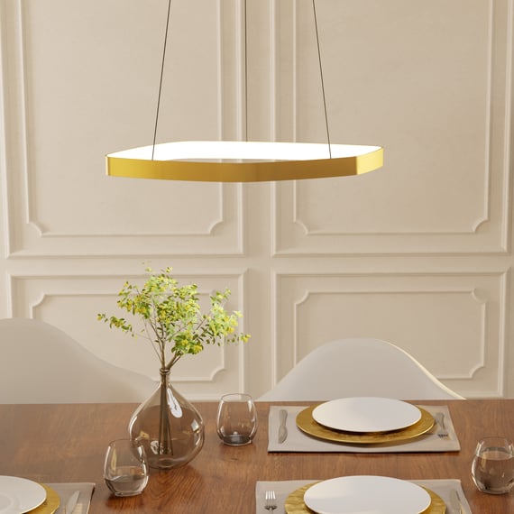 The VALLEROSA LED pendant light is made of metal in brushed brass with an organically shaped LED profile hung from a round canopy in brushed brass. The integrated LEDs under the white plastic cover produce a pleasant warm white light and are dimmable with a suitable rotating dimmer on the wall. Thanks to its stylish design, the pendant light can be integrated into modern interiors and offers elegant lighting for any room, whether in the living room or dining room.