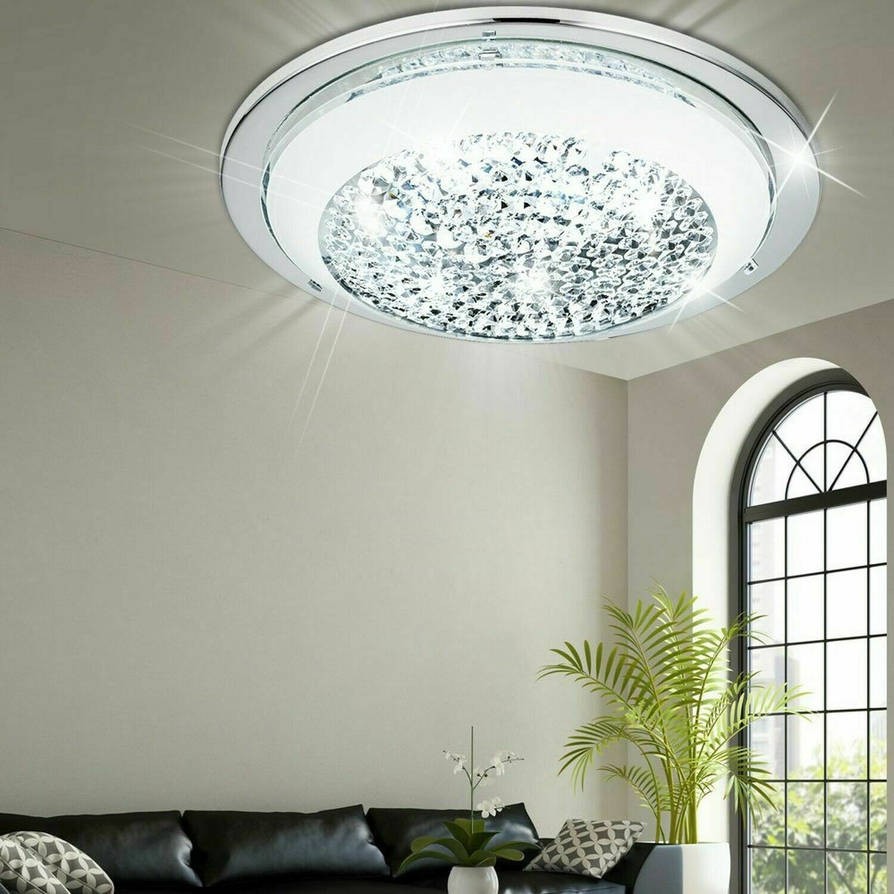 Eglo Lighting Acolla LED flush ceiling fitting features a circular ceiling plate and frame in polished chrome finish with a central display of clear crystal buttons and white glass.