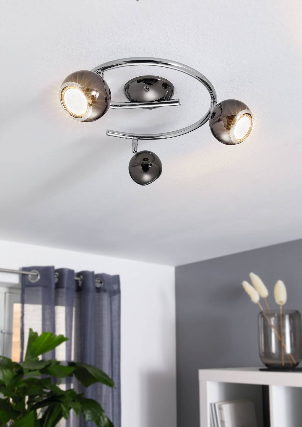 Eglo Lighting Bimeda 3 light LED spotlight fitting features a circular design back plate in black nickel finish holding a circular chrome bar with 3 round 'eyeball' shaped spotlights in with polished chrome finish edging.