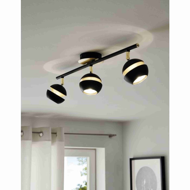 Eglo Lighting Nocito LED 3 light ceiling fitting features a circular back plate with slender bar holding 3 adjustable globe shaped lamp heads in black and gold finish.