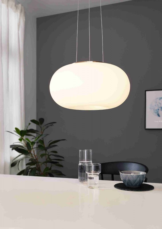 This is an Eglo product, item code 86814. The Optica 2 light modern ceiling light Pendant (medium) is a simple yet effective deisign with a doughnut shaped opal glass shade and nickle matt finish.