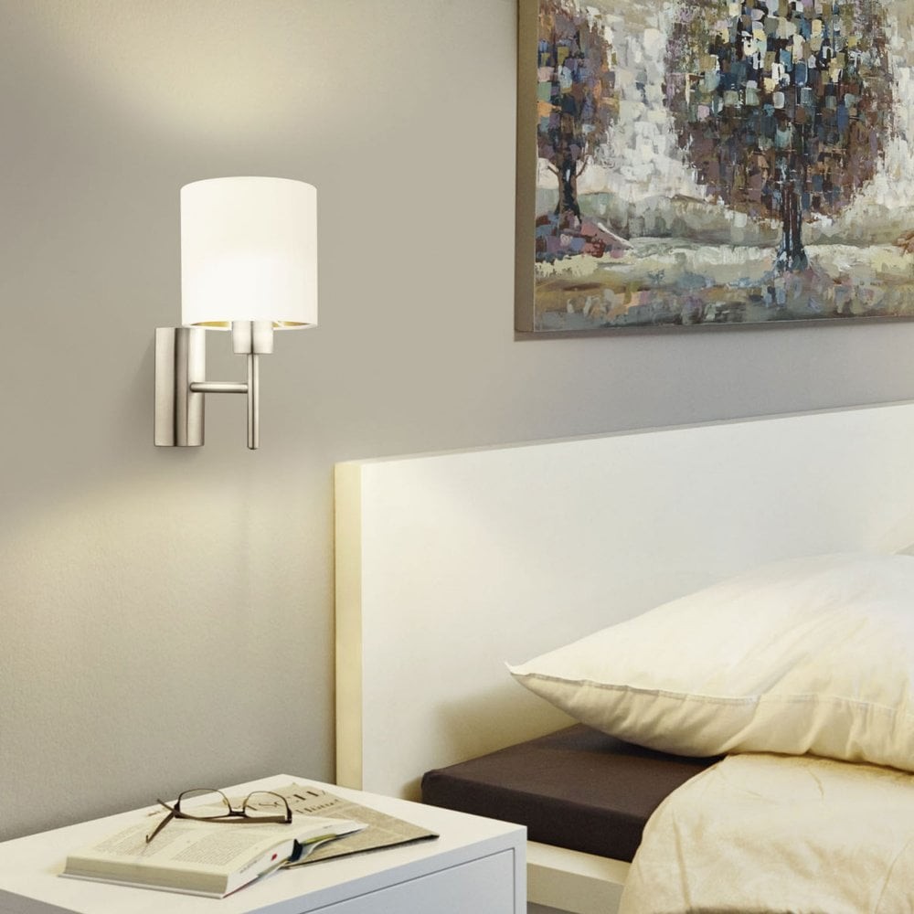 Eglo Lighting Pasteri single light wall fitting features a satin nickel finish wall plate with extending arm with a cylindrical shaped white fabric shade and copper inner.