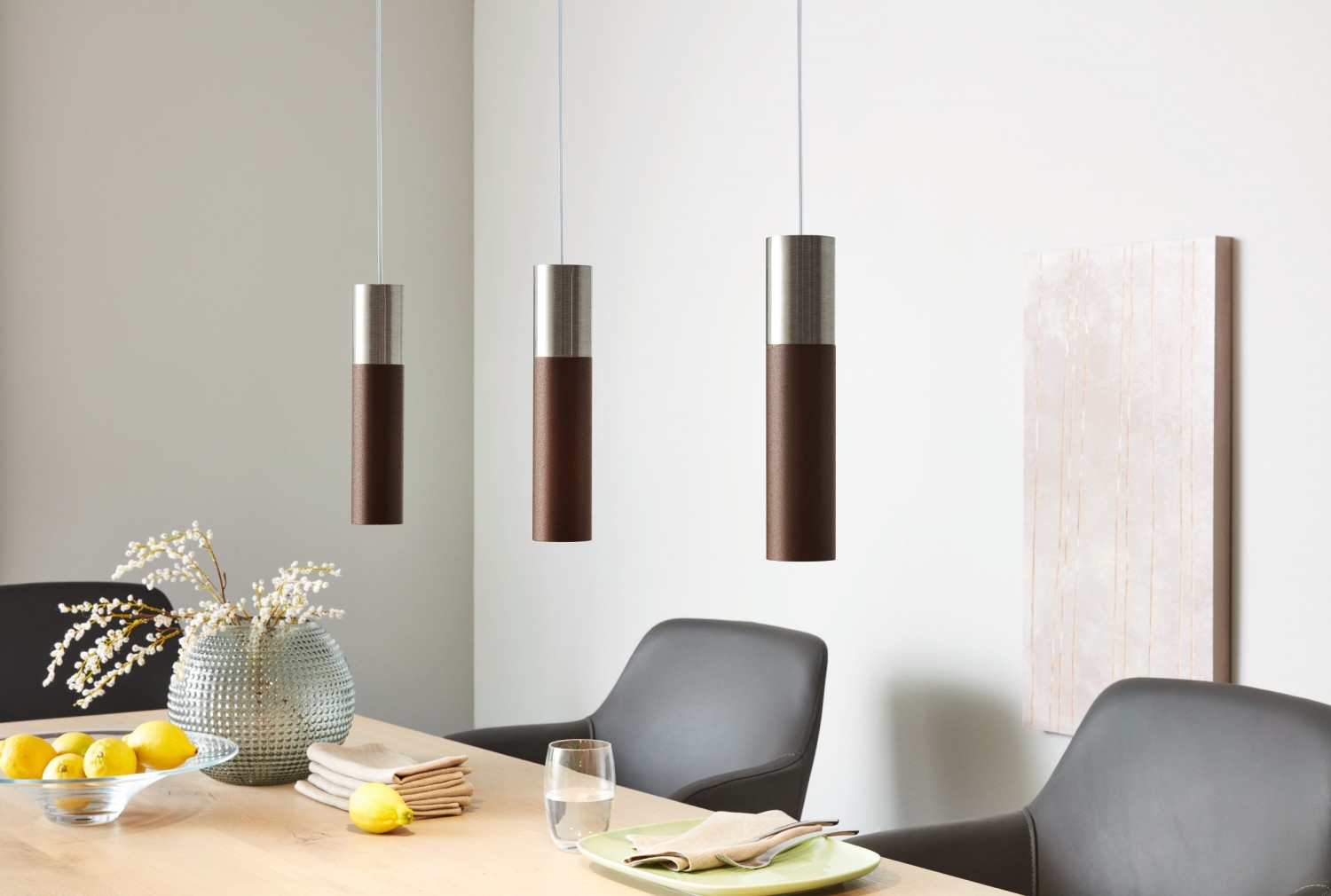 Eglo Lighting Villora 3 light ceiling pendant features a circular ceiling cup in satin nickel finish with a cylindrical shade in both satin nickel and antique brown finish. The combination of nickel and antique brown finish adds a striking look and can be hung in groups or individually over kitchen islands and dining tables, making this perfect for modern or contemporary decors.
